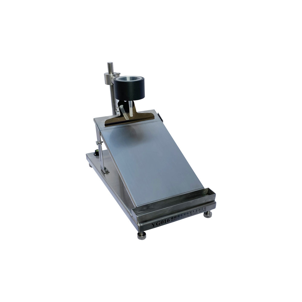 用于非織造布液體流失性能的測定。在被測非織造布下放置一塊標準吸收媒介,將組合試樣置于一塊傾斜的墊板上,測量當一特定量的人工尿液向下流到組合試樣上,液體穿透非織造布被標準吸收媒介吸收,通過稱量標準吸收媒介試驗前后重量的變化得出非織造布試樣的液體流失性能。